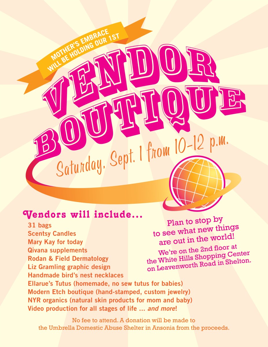 Mother’s Embrace Vendor Boutique flyer Published August 14, 2012 at 1932 × 2500 in Home Next → An 8.5 by 11 flyer for a vendor boutique at Mother’s Embrace Yoga Studio in Shelton, CT. Like Loading...