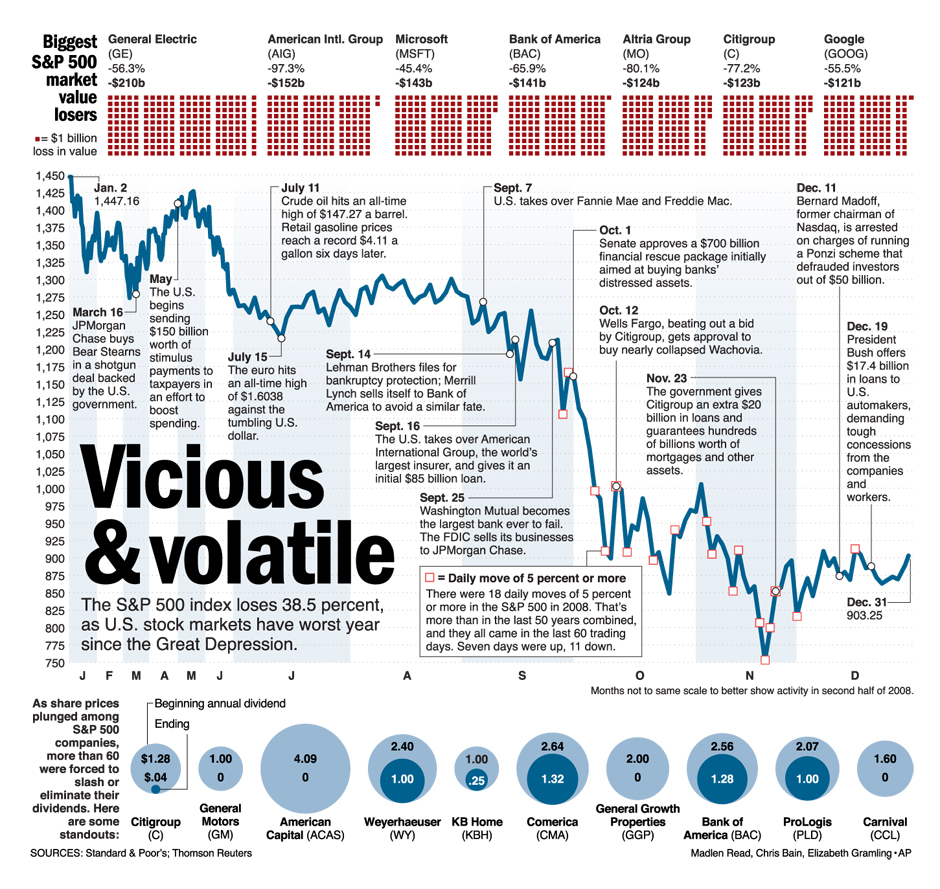 Year-end infographic Published August 31, 2012 at 940 × 889 in Home ← Previous Next → This year-end centerpiece graphic for The Associated Press captures the volatility of the U.S. stock markets in 2008. Like Loading...
