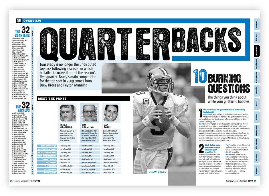 Fantasy League Football 2009 magazine — inside spread Published August 31, 2012 at 940 × 684 in Portfolio ← Previous Next → The quarterbacks introduction spread features picks from three staff experts, the projected starters and backups for the position and the beginning of the article “10 Burning Questions.” Like Loading...