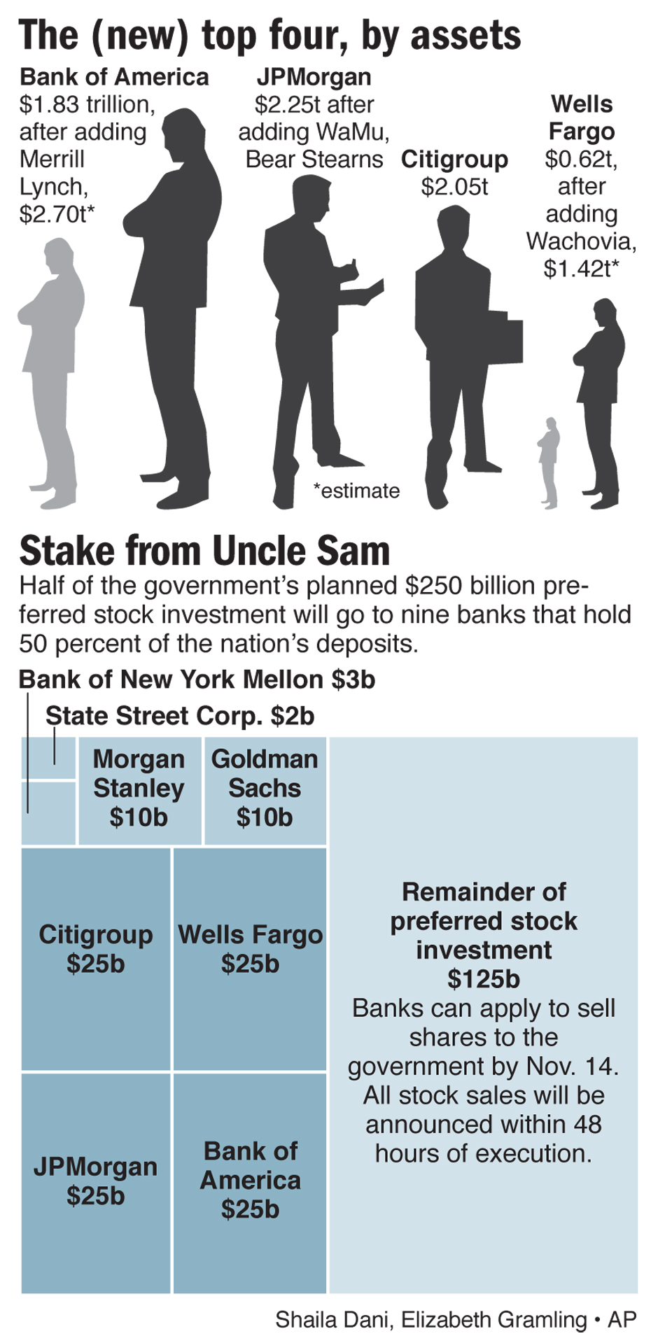 Treemap and picture infographic Published August 31, 2012 at 940 × 1919 in Portfolio ← Previous Next → This picture graphic shows the sizes of the four largest U.S. banks by assets. The treemap shows how the government’s $250 billion preferred stock investment was split up. For The Associated Press. Sources: the companies, analysts, AP reports. Like Loading...